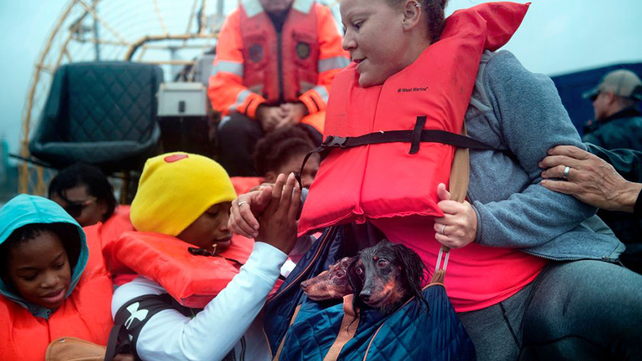 | People board a Harris County Sheriff airboat while escaping a flooded neighborhood during the aftermath of Hurricane Harvey Aug. 29, 2017 in Houston, Texas. |